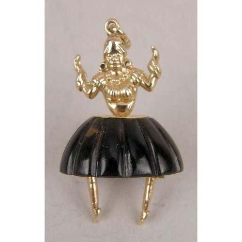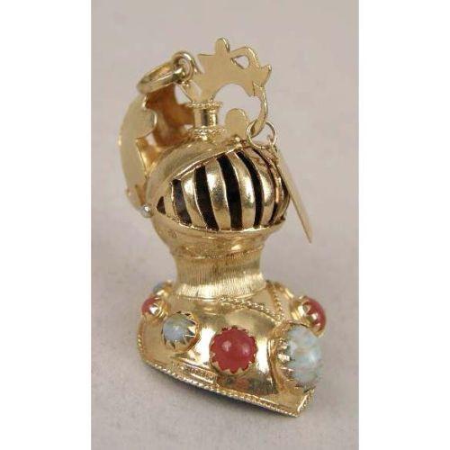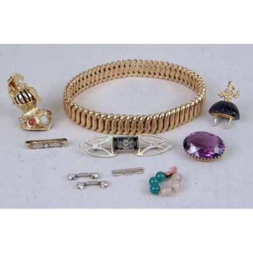 A GROUP OF JEWELRY<BR><BR>Including an "American Queen" expandable gold filled choker necklace, Pat. Date 1908, a 14kt yellow gold knight`s helmet pendant set with stones and tag reads "Jamaica", 1-1/2"h, an 18kt yellow gold dancer charm/pendant, and an oval yellow gold amethyst brooch