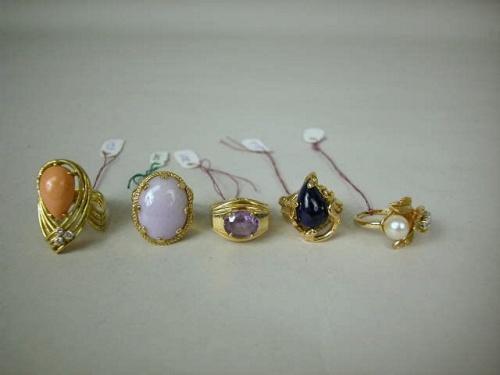 A GROUP OF LADY'S YELLOW GOLD RINGS, comprising: a purple coral? ring, a yellow gold and amethyst ring, a yellow gold and lapis ring, a yellow gold and coral ring, a yellow gold and pearl and small diamond flora-form ring
