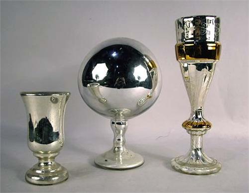 A GROUP OF MERCURY GLASS; Comprising: a silver footed "witches ball", 10-1/2"h, a silver and gold etched vase, 12"h, and a silver vase, 6-1/4"h, losses