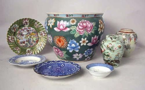 A GROUP OF MISCELLANEOUS PORCELAIN; Comprising two ginger jars, four plates and a planter, Japan and China, minor losses to lid of ginger jar and green plate, 7 pieces, planter 10" h