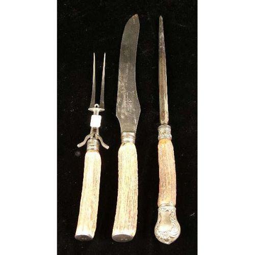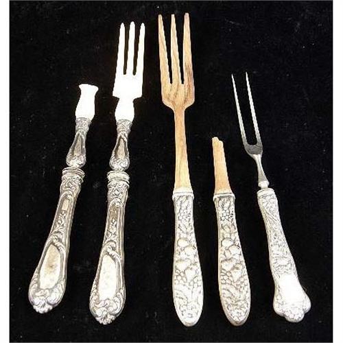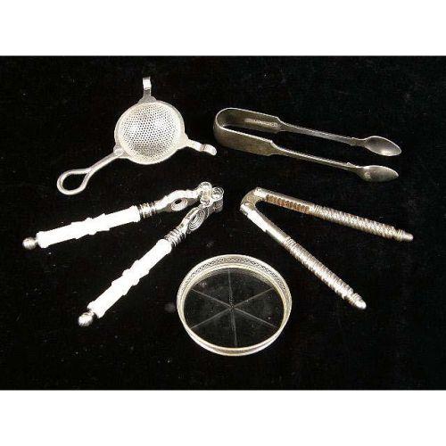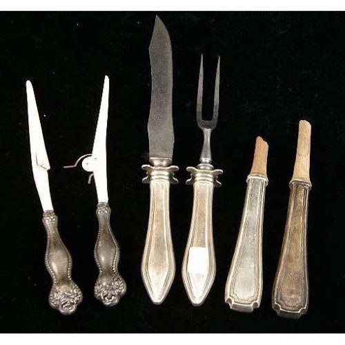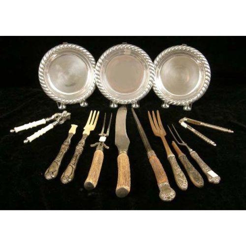 A GROUP OF MISCELLANEOUS SILVER PLATED AND STERLING SILVER HANDLED TABLE ITEMS<BR><BR>Including a carving set, nutcrackers, and 3 boxed plates