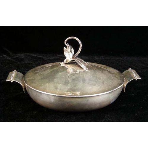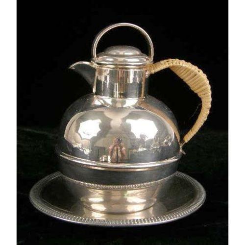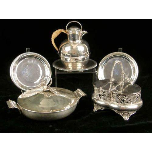 A GROUP OF MISCELLANEOUS SILVER PLATED TABLE ITEMS<BR><BR>Including a handled covered box, a raffia handled hot water bottle, and circular dishes