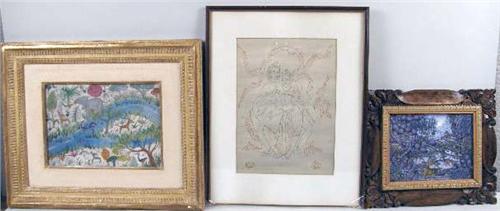 Comprising an Indonesian print initialed K.T.L.E. (?), an oil on canvas river scene, signed illegibly l.r.c., and an oil on canvas of an Indonesian river scene, signed l.l. I. NY Swwija Baung Bud Bali `94 (?). 3 pieces. From 7"h x 9"w to 14"h x 10"w