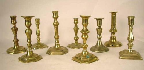 A GROUP OF NINE ASSORTED CAST-BRASS CANDLESTICKS; probably English, most lacking ejector mechanisms, otherwise average wear, 9 pieces, tallest 7 1/2" h