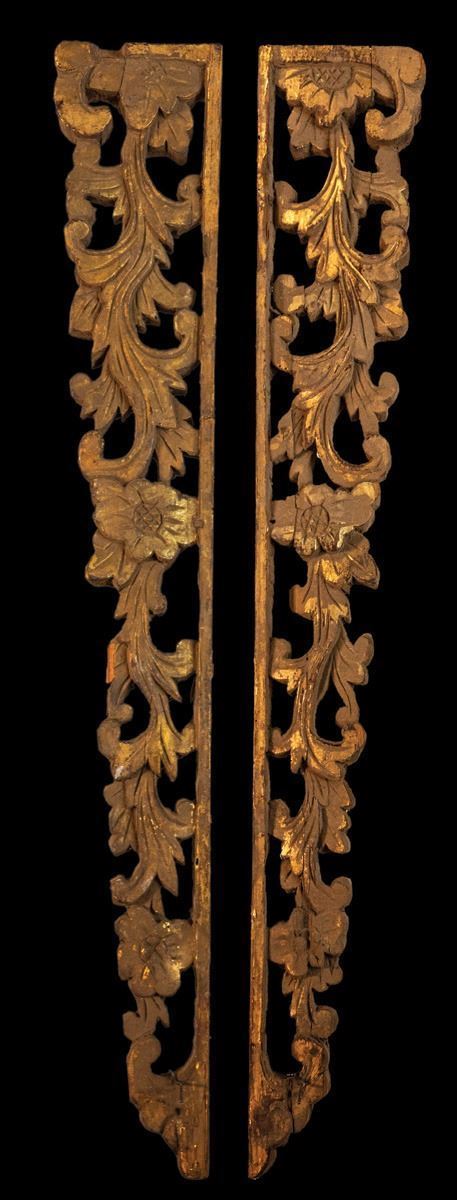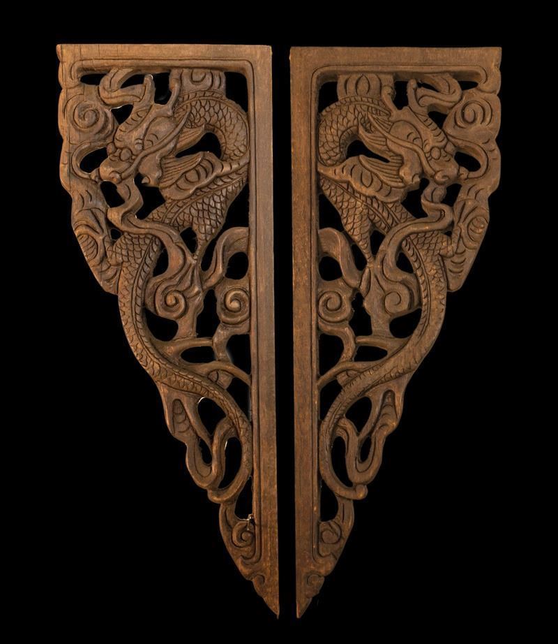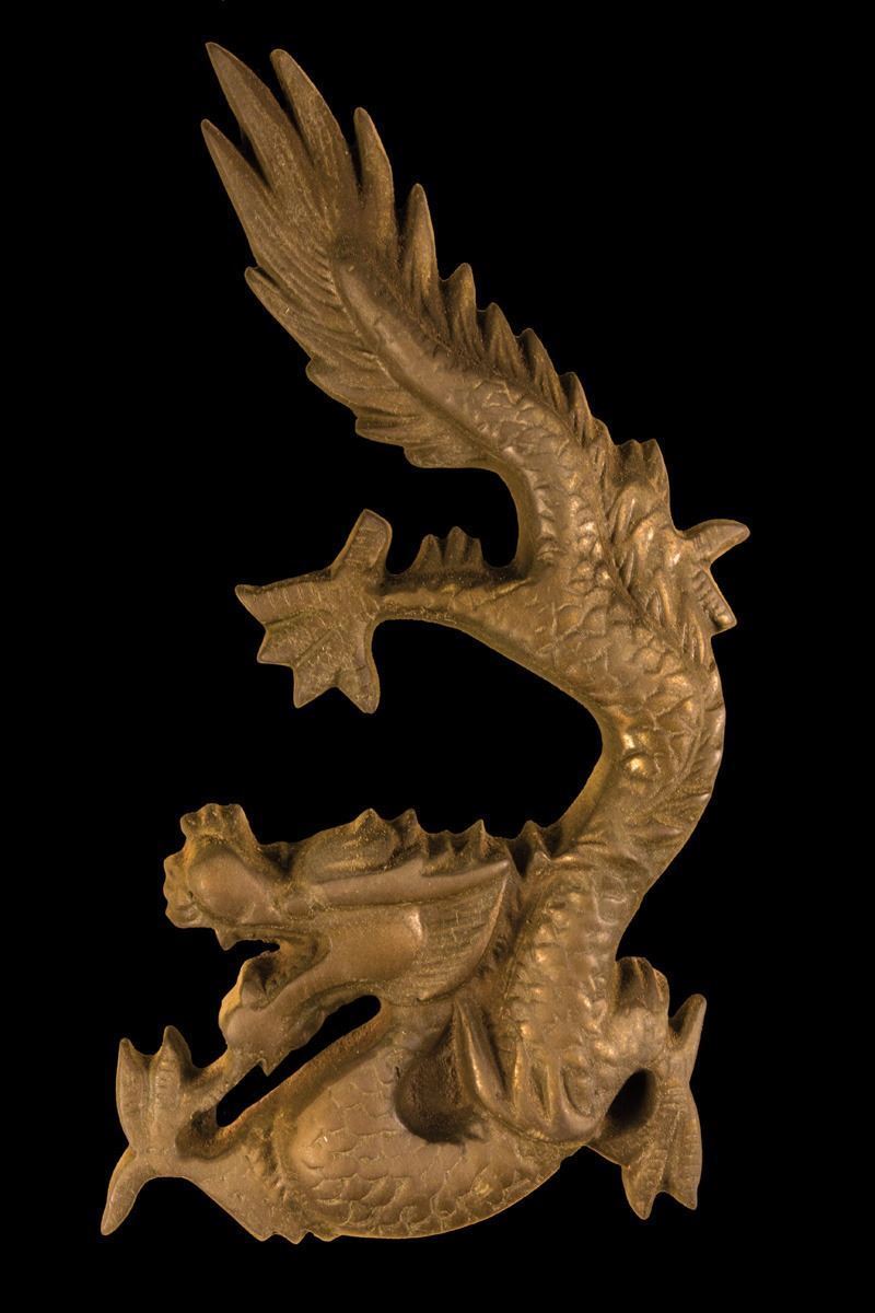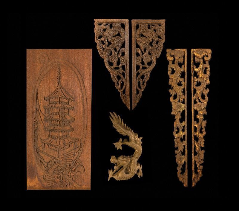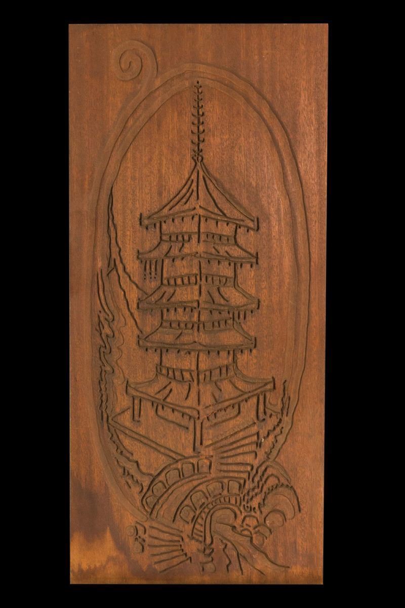 (1950s) A collection of very early OA Asian motif carvings. Chinese dragon and floral corbel accents. A bronze Chinese dragon door pull master sample. These were commissioned for Chinese restaurants across the country.DOOR PULL: 9.25”x5” to LARGEST PANEL: 20”x9”.VG+