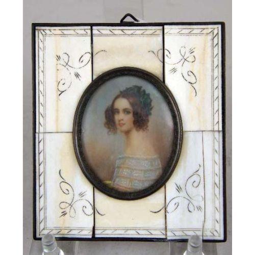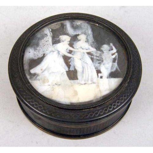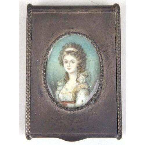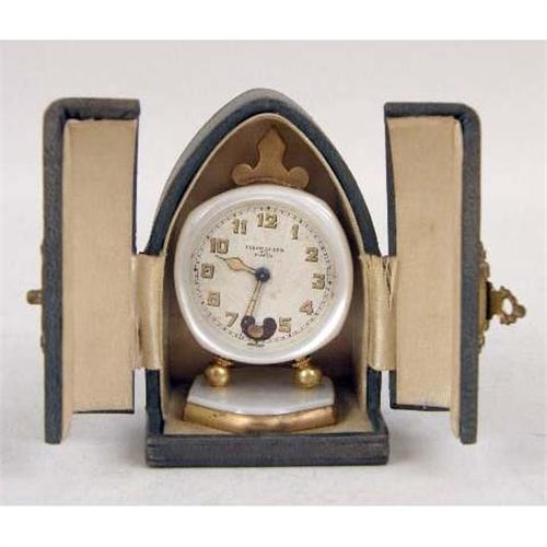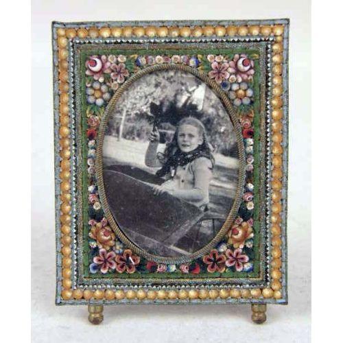 A GROUP OF OBJETS DE VERTU<BR><BR>Comprising: a sterling gilt silver circular covered box, the top with print of putti and figures, hallmarked on base, stamped Sterling on side, 1"h x 3-1/4", a silver hinged box with portrait of woman, box, 3"h x 2"w, a German or Italian painting on ivory of "Prinzess Alexandra" label on back, with ivory inlay, frame, 3" x 3-1/4", a Fleur de Lis Paris miniature alarm clock in original case, 2-1/4"h, and two small mosaic and enamel frames. 6 pieces