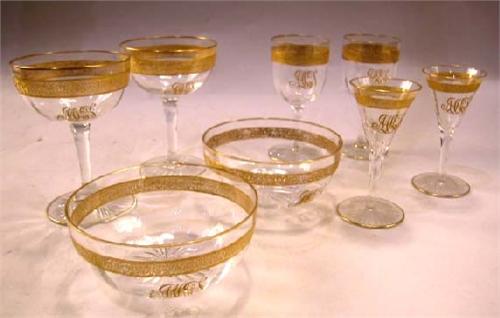 A GROUP OF PARCEL-GILT COLORLESS GLASS STEMWARE; Comprising five fingerbowls, twelve champagne glasses, five cordials and twelve aperitifs (34 pieces)