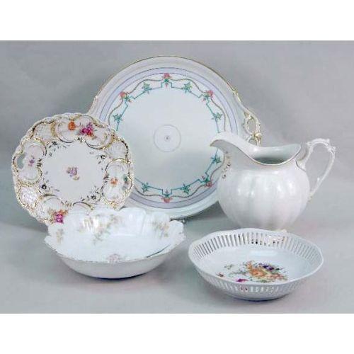 A GROUP OF POLYCHROME AND PARCEL-GILT DECORATED PORCELAIN SERVING PIECES<BR><BR>Including, trays, bowls, and a pitcher, losses and wear, 5 pieces