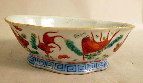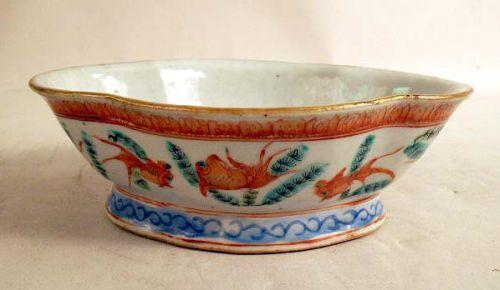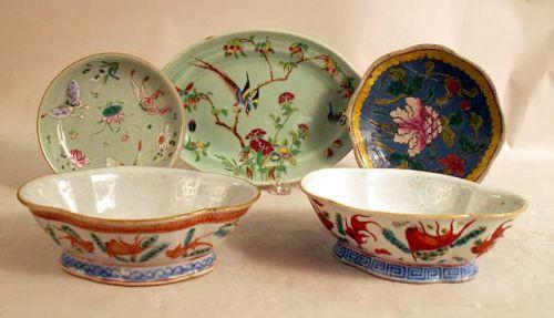Comprising four bowls and a platter, 10"l. Some cracks and repairs. 5 pieces.