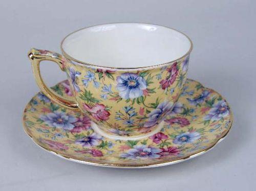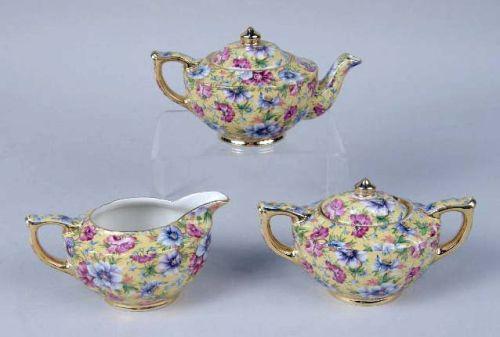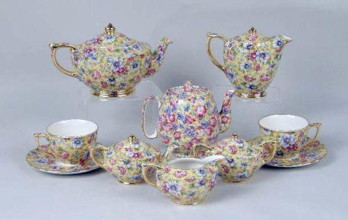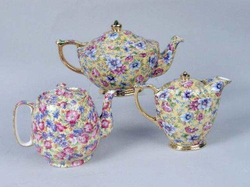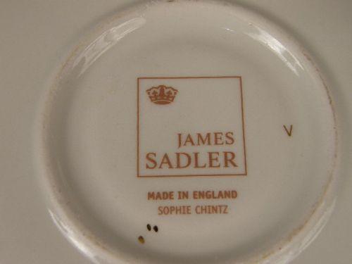 Comprising, five teapots, a creamer and sugar, six cups and saucers, all marked underside "James Sadler, Made in England, Sophie Chintz," Together with a chintz teapot, marked "Royal Winton, Grimwades Ltd., Made in England Approximately 20 pieces