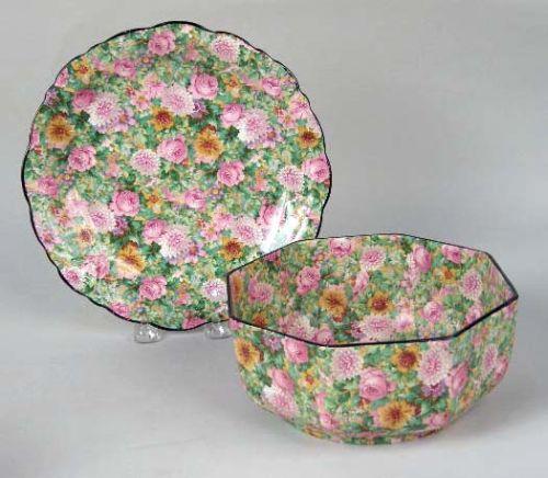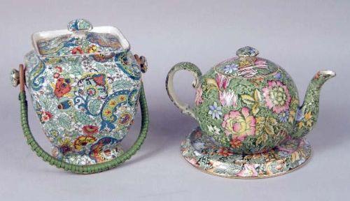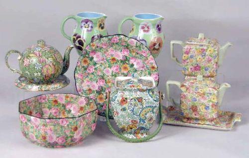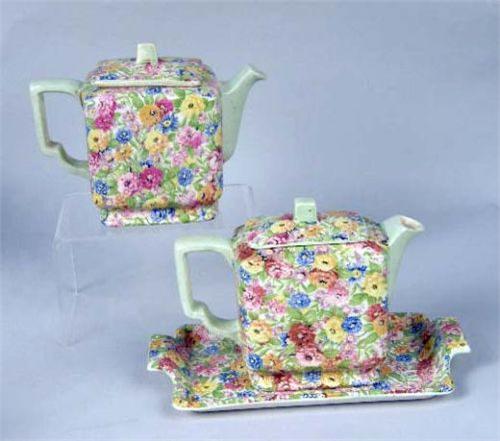 Comprising, three teapots, a covered sugar, an octagonal shaped bowl, a plate, a small handled tray, a hot plate, and two pitchers, including marks, "Crown Ducal Wear, England," "Royal Winton," "Kenginston Wear, England," and "Farrett," 10 pieces