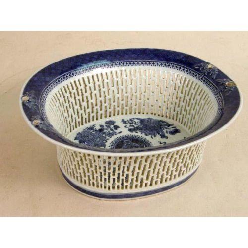 A GROUP OF PORCELAIN TABLE ARTICLES<BR><BR>Comprising, a blue and white Chinese export reticulated basket, a blue and white shallow bowl, marked Royal Copenhagen, Denmark, a blue and white small tray, a blue and white covered jar, and a reticulated basket marked Royal Vienna, 3 1/4"h x 8 1/4"w 5 pieces