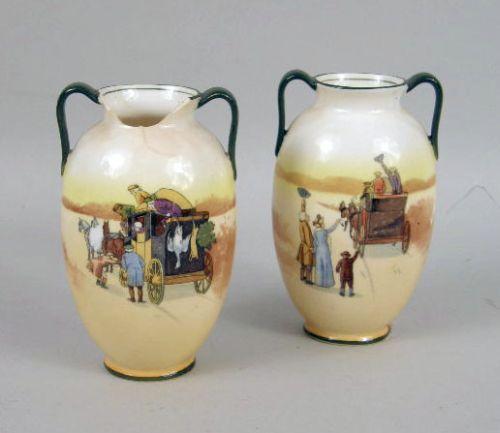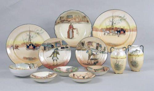 Including two dinner plates, two salad plates with "Trolly Veek," four small fruit bowls, a bowl depicting "The Artful Dodger," and two vases. Together with a soup bowl. 12 pieces. One vase broken.