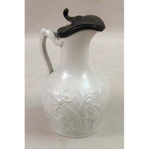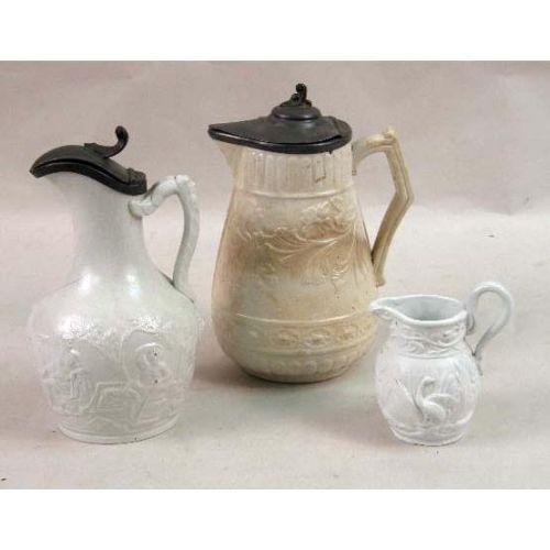 A GROUP OF SALT GLAZED JUGS<BR><BR>Two with metal mounted hinged lids, cracks and losses, 8"h