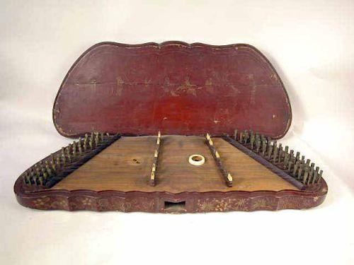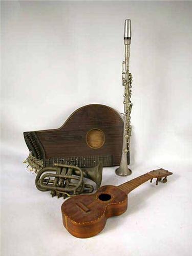 Including a ukulele, a silver clarinet, a coronet, two horizontal stringed instruments, one in a lacquer case, and two wood and metal clappers. Losses, wear, distressed.