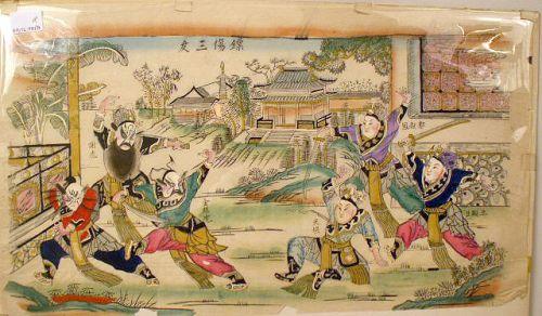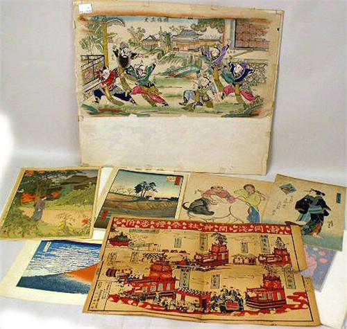 Probably Japanese. One torn in half, several with tears at margins. Largest 15"h x 25"w. Together with a print of children and lanterns, bears signature lr "F. Capelari". 9"h x 6"w. 8 pieces.