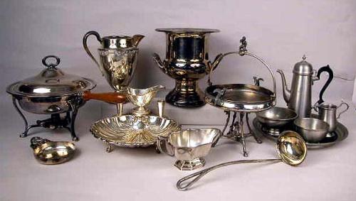 A GROUP OF SILVER PLATE ITEMS; Comprising, ice bucket, pitcher, bowls, shrimp server, ladle, chafing dish, souvenir spoons, and pewter set