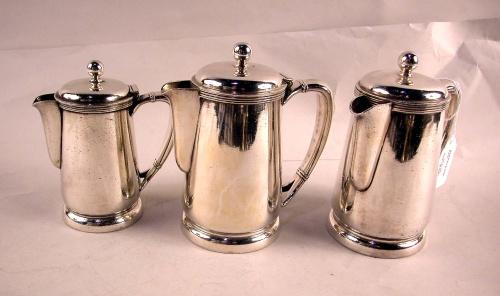 A GROUP OF SILVER PLATED COFFEE POTS, SUGAR BOWLS AND CREAM JUGS; Largest 9 1/2"h