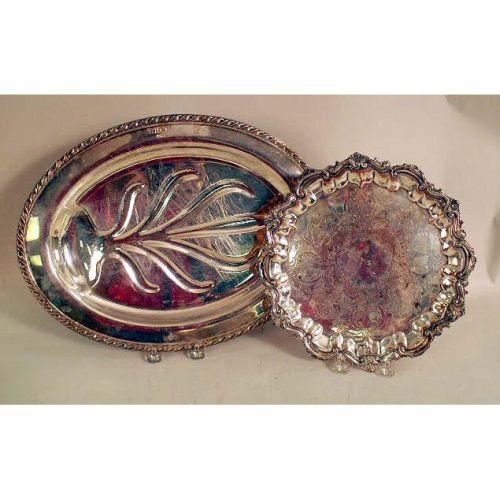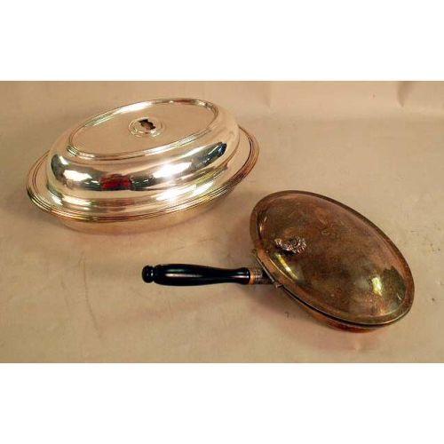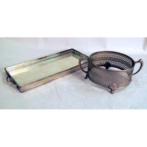 A GROUP OF SILVER PLATED ITEMS<BR><BR>Including a well-and-tree platter, a silent butler, a plant holder, and a Tiffany silver-soldered covered vegetable dish, 11"l