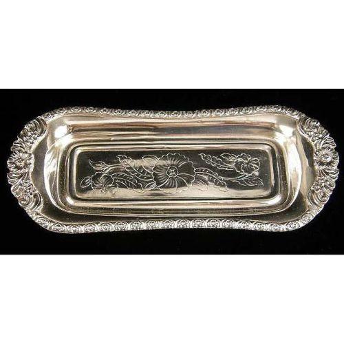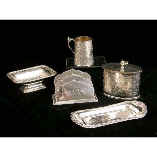 A GROUP OF SILVER PLATED ITEMS<BR><BR>Including a letter holder, biscuit box, bowl and pin tray, 5 items