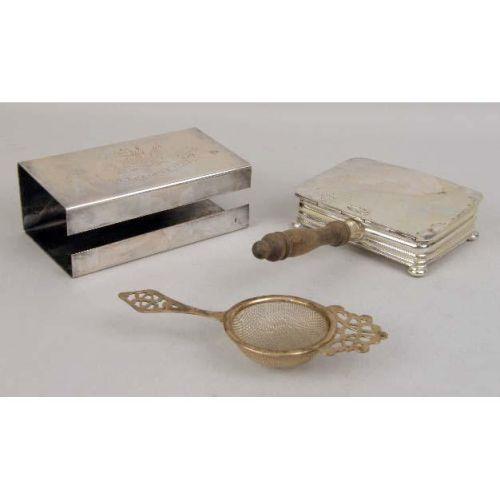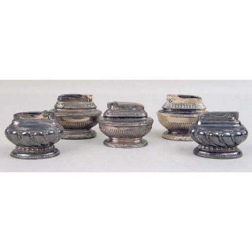 A GROUP OF SILVER PLATED TABLE ARTICLES<BR><BR>Including, five Ronson lighters, a pair of candlesticks, and a tea strainer. 12 pieces