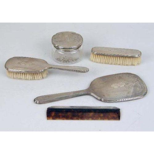 A GROUP OF SILVER PLATED TABLE ARTICLES<BR><BR>Including, a vanity set, a cake server marked Sheffield, two Reed and Barton bowls, assorted lids, and shell form dishes. 20 pieces