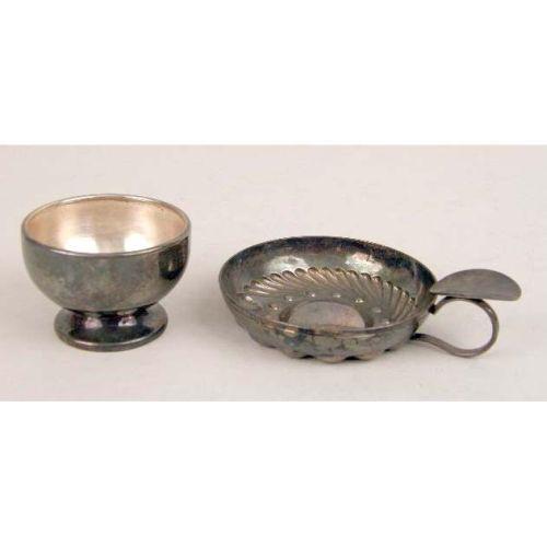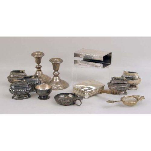 A GROUP OF SILVER PLATED TABLE ARTICLES<BR><BR>Including, five Ronson lighters, a pair of candlesticks, and a tea strainer. 12 pieces