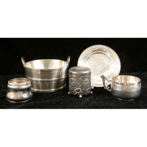 A GROUP OF SILVER PLATED TABLE ITEMS<BR><BR>Including an ice bucket, 3-1/2"high x 6-1/2"diameter