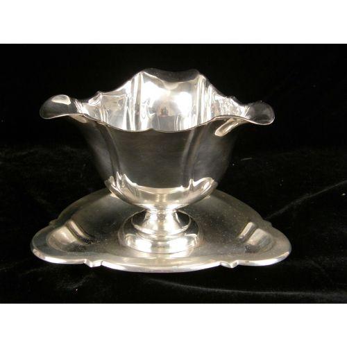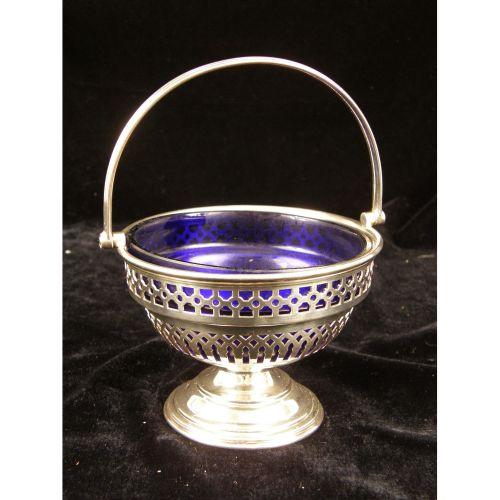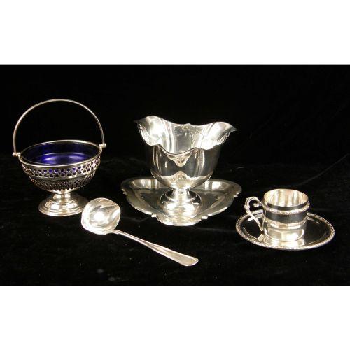 A GROUP OF SILVER PLATED TABLE ITEMS<BR><BR>Including a gravy boat with attached underplate, and a sugar basket with cobalt glass liner