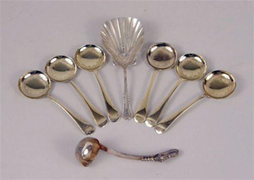 Including flatware, bread and butter plates, six service plates, a Mexican sterling saucer ladle, sterling pierced serve, silverplate vermeil soup spoons, two mother-of-pearl handled fish knives in presentation box, Gerber three piece stainless carving set, miscellaneous demi-tasse spoons, and a three-piece fish serving set in box. 23 pieces.