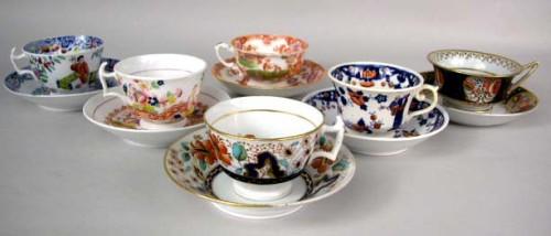 A GROUP OF SIX ASSORTED TEACUPS & SAUCERS; Polychrome decorated, three unmarked, one illegible mark, one marked B & S warranted, and one marked H & S, losses