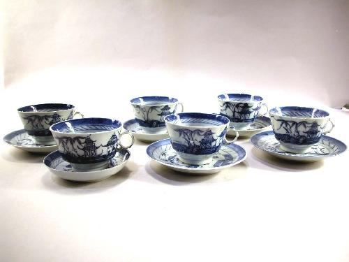 A GROUP OF SIX CHINESE EXPORT PORCELAIN TEA CUPS AND SAUCERS; Canton pattern, (together by association, losses)