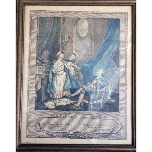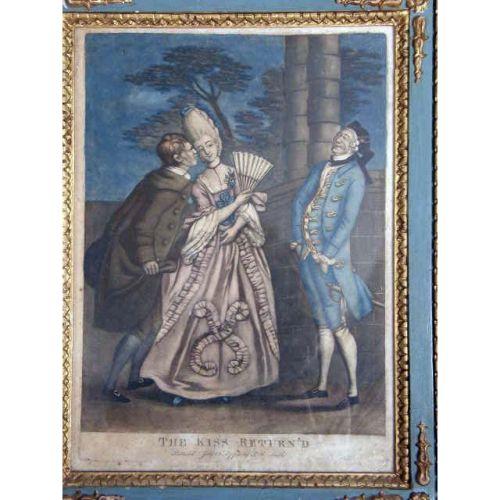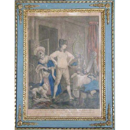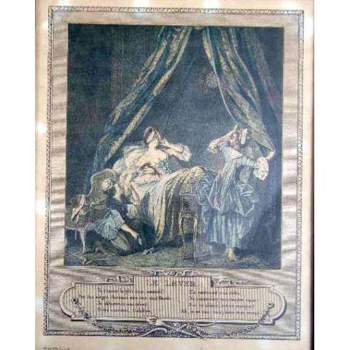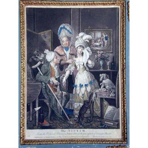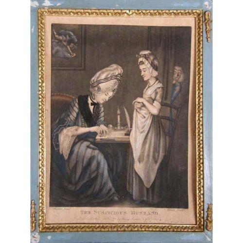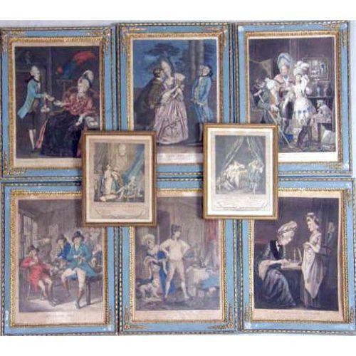 A GROUP OF SIX FRAMED ENGLISH PRINTS<BR><BR>Including, "The Victim, The Kiss Return`d" and "The Suspicious Husband," 14"h x 10-1/4"w. Together a pair of prints, 7-3/4"h x 7-3/4"w, 8 pieces