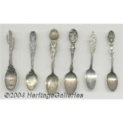 <B>A GROUP OF SIX SILVER FIGURAL SOUVENIR SPOONS</B></I><BR>Various makers, c.1900<BR><BR>Including three art nouveau women and three full figure cactus, <I>marked reverse of handles</B></I><BR>the longest, 5.75in. 6 Items <BR><BR><B>Important notice:</B> Heritage usually auctions material at the rate of 200-250 lots per hour. On some occasions eBay Live bid software or the Internet may not be able to keep up with the pace of the auction. We recommend placing a realistic absentee bid now as insurance to avoid disappointment. Occasionally the auctioneer may eliminate or reject an eBay Live bid, and the auctioneer may also reopen a lot after the close of the eBay live bidding (usually because we missed an audience bid), and may reject your bid even if it shows you as the winning bidder. By bidding via eBay Live, you agree that Heritage may award the lot to another bidder at its sole discretion under the circumstances described above or any other reasonable circumstances. Since eBay bids are not shown to us until we open the lot on the floor, we treat those bids just like floor bids. In most cases the floor responds before the eBay bid is presented to us, due to Internet lag time, so for consistency we have made it a policy that floor bids are always considered first over tie eBay live bids. Also please note that all Heritage lots purchased through eBay Live carry a 25% Buyer's Premium. Please make sure you read the Terms and Conditions before you bid. <BR><BR><B>IMPORTANT ANNOUNCEMENT ABOUT RESERVES:</B> Heritage now divulges all reserves on its web site 7 days before every auction. If you want to know whether the reserve on this lot has been met, and if not, what the reserve amount is, please visit this lot page on the HeritageCoin.com web site, or email: bid@HeritageGalleries.com </span></font>