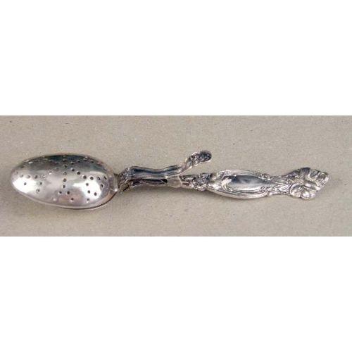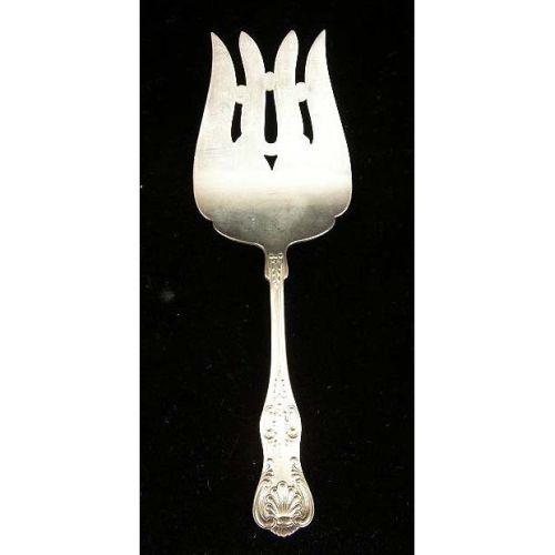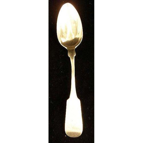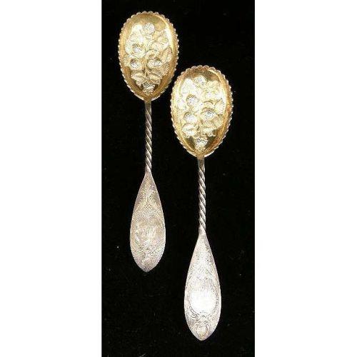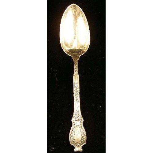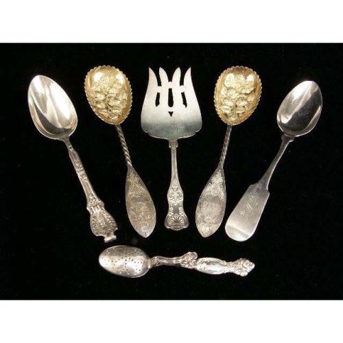 A GROUP OF SIX SILVER SERVING FLATWARE PIECES<BR><BR>Including a pair of Bailey & Co coin silver berry spoons, monogrammed, a Baldwin coin silver tablespoon, monogrammed, 9"long, and a sterling silver tea strainer spoon, serving fork and serving spoon, total weight apx. 13 T.O.