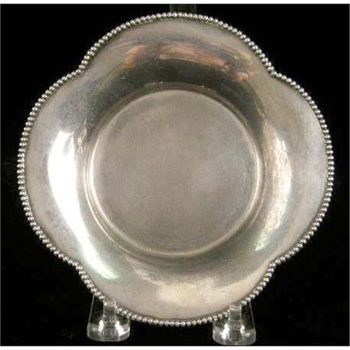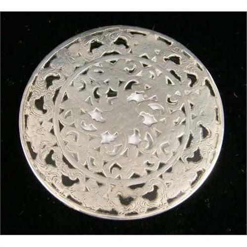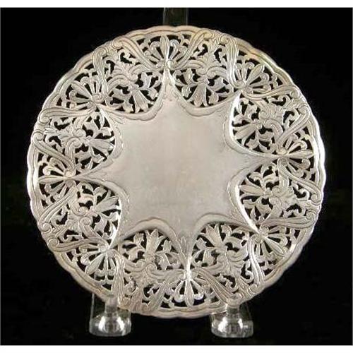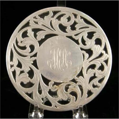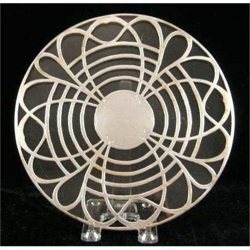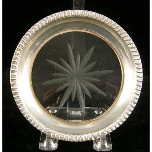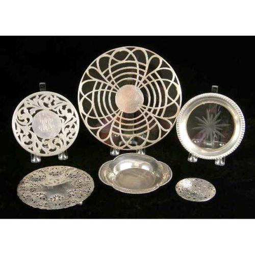 A GROUP OF SIX TABLE ITEMS<BR><BR>Comprising three sterling silver and glass trivetts, the largest 8-7/8"diameter, asterling silver mounter bottle coaster, a silver plated footed trivett. and a silver plated shallow dish