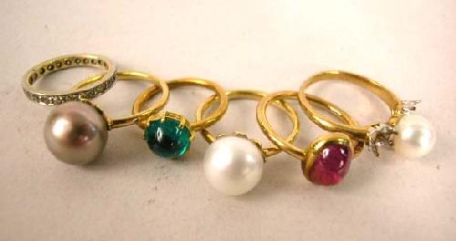 A GROUP OF SIX YELLOW GOLD RINGS; Comprising: one set with an oval cabochon pink sapphire, a Tiffany & Co. 9.5 mm, a 10.60 mm pearl ring, an emerald ring, weighing .50 ct, a pearl ring, missing two side stones, and a diamond band, with 26 diamonds, est. weight .50 ct