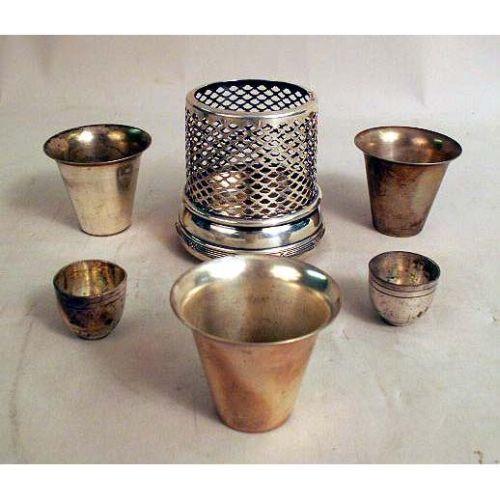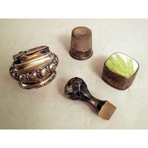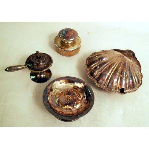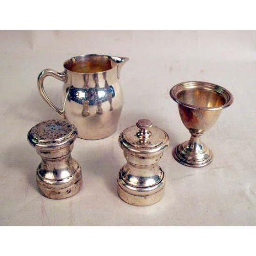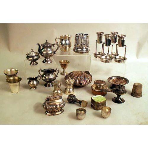 A GROUP OF SMALL SILVER PLATED ITEMS<BR><BR>Including, a lighter, small creamers, shell-form box, and salt and peppers, approximately 35 pieces