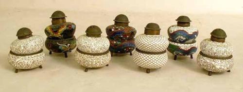 Comprising seven salt shakers atop matching pepper shakers. From 1 1/2" to 2"h.