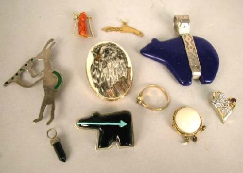 A GROUP OF STERLING SILVER AND GOLD PINS AND PENDANTS; Together with two beaded necklaces