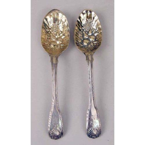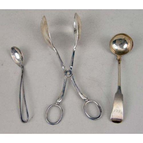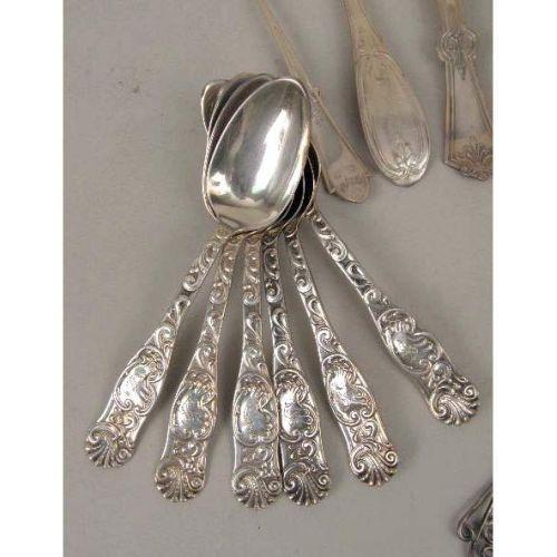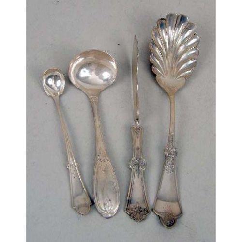 A GROUP OF STERLING SILVER AND SILVER-PLATE FLATWARE<BR><BR>Including: a set of twelve Towle 1889 teaspoons, monogrammed, a sterling baby spoon, two English berry spoons, chased bowls with vermeil, maker`s mark, WEWF, engraved crest, 8-3/4"l, a English sauce ladle, maker`s mark, DMCd, and eight assorted Victorian serving pieces