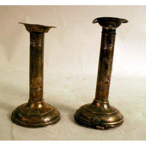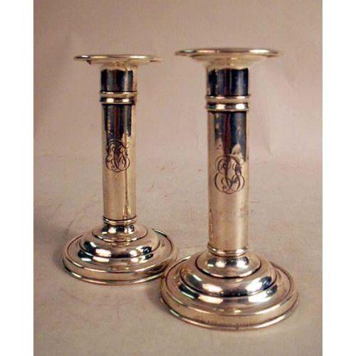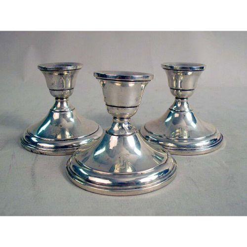 A GROUP OF STERLING SILVER CANDLESTICKS<BR><BR>Including three short weighted with H monogram, tallest 6-1/2"h