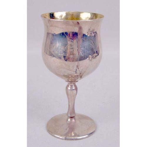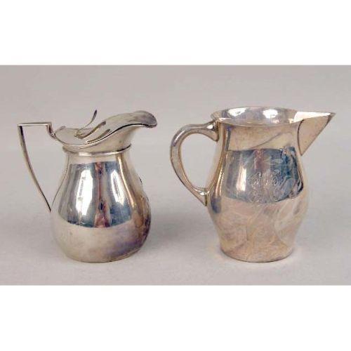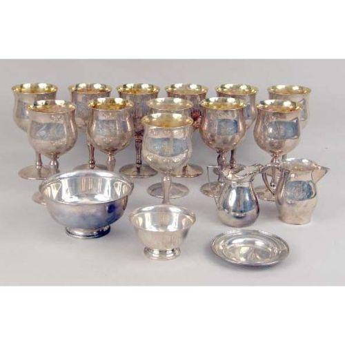 A GROUP OF STERLING SILVER HOLLOWWARE ITEMS<BR><BR>Including a Fisher Revere "Paul Revere" bowl, 3"h x 5-3/4"dia., matching open sugar bowl and cream jug, a syrup jug and underplate, a set of 12 Reed & Barton water goblets, vermeil interiors, monogrammed, #X115, 6-1/4"h. 17 pieces