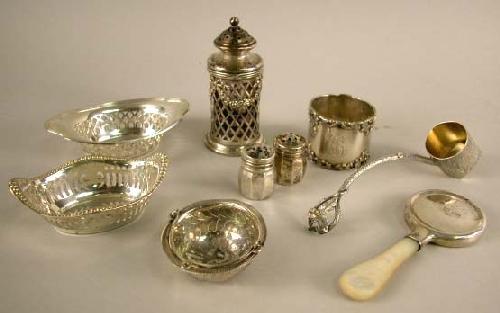A GROUP OF STERLING SILVER ITEMS; Including: a Gorham set of twelve nut dishes, #A4775, and a Gorham set of six nut dishes, #A7975, both monogrammed, a napkin ring, monog., a Black Starr & Frost salt shaker with glass liner, a rattle with mother-of-pearl handle, apx. 16 T.O.