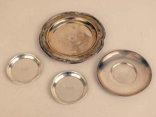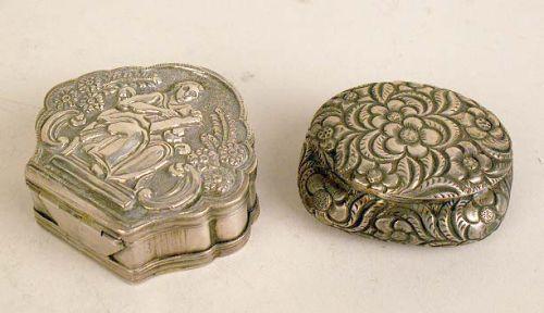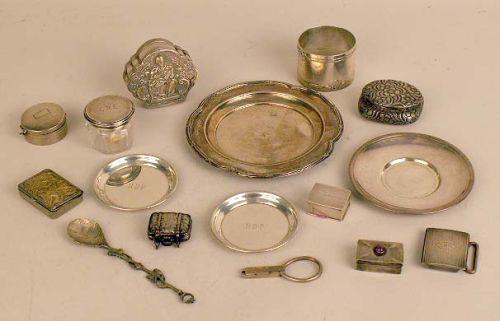 Including a snuff box with all-over floral chasing, and three pill boxes, together with a sterling silver lidded dresser jar, 1-1/2"dia., and a miscellaneous group of sterling silver and silver plated items, total weight apx. 5 T.O. weighable