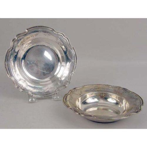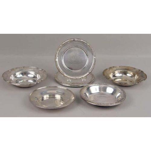 A GROUP OF STERLING SILVER TABLE ITEMS<BR><BR>Including a pair of Reed & Barton bonbon dishes, a JE Caldwell, and a Reed & Barton bonbon dish, and a set of eight Frank Whiting bread & butter plates, each 6"diameter, total weight 29 T.O.