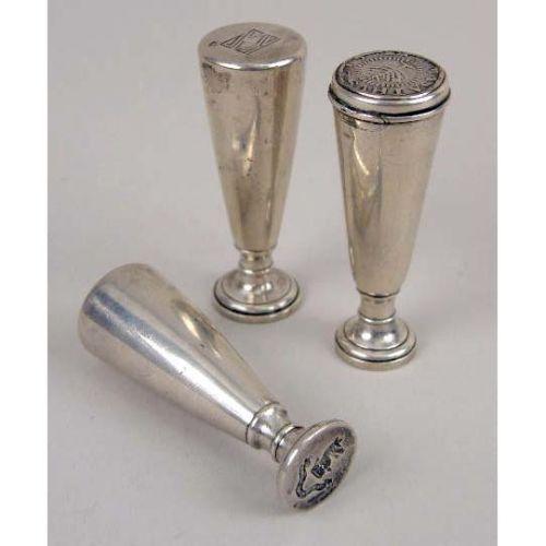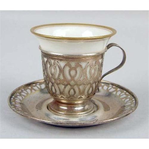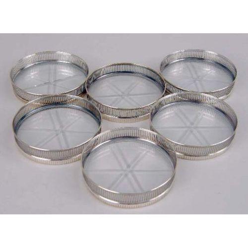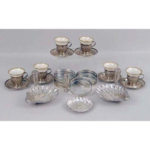 A GROUP OF STERLING SILVER TABLE ITEMS<BR><BR>Including a set of six Frank Whiting demi-tasse holders with underplates and Lenox porcelain liners, three Tiffany & Co stamps, and a set of sterling mounted glass coasters, together with three silver plated shell-form dishes, total weight apx. 11 T.O.