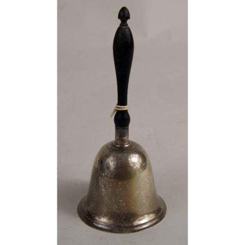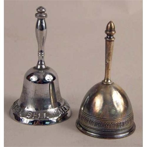 A GROUP OF TEN ASSORTED DINNER AND SERVING BELLS<BR><BR>comprising one sterling silver bell with a carved ebony handle and a tag reading "Groff, Washbourn & Dunn 1899-1961"