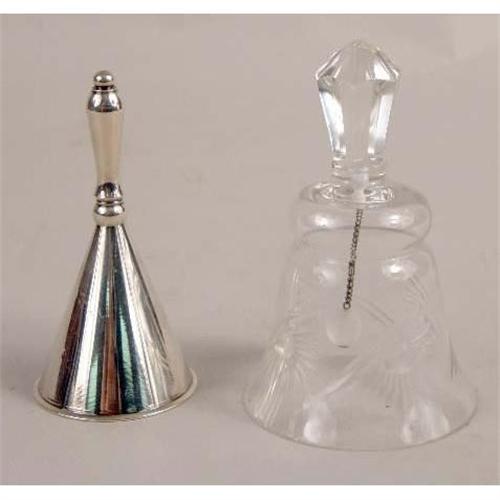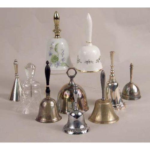 A GROUP OF TEN ASSORTED DINNER AND SERVING BELLS<BR><BR>comprising one sterling silver bell with a carved ebony handle and a tag reading "Groff, Washbourn & Dunn 1899-1961", a silver-plated example stamped "GM Cie. / EP", two porcelain bells, one stamped "Minton Bone China / Made in England", a cut-glass example, and five silver metal examples, one stamped "Memorial Bell". Heights from 4" to 6".