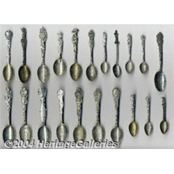 <B>A GROUP OF THIRTY-EIGHT SILVER STATE SOUVENIR SPOONS</B></I><BR>Various makers, c.1900<BR><BR>Includes twenty Oregon, eighteen Alaska, mostly teaspoons, <I>marked sterling reverse of handles</B></I><BR>Various lengths 38 Items <BR><BR><B>Important notice:</B> Heritage usually auctions material at the rate of 200-250 lots per hour. On some occasions eBay Live bid software or the Internet may not be able to keep up with the pace of the auction. We recommend placing a realistic absentee bid now as insurance to avoid disappointment. Occasionally the auctioneer may eliminate or reject an eBay Live bid, and the auctioneer may also reopen a lot after the close of the eBay live bidding (usually because we missed an audience bid), and may reject your bid even if it shows you as the winning bidder. By bidding via eBay Live, you agree that Heritage may award the lot to another bidder at its sole discretion under the circumstances described above or any other reasonable circumstances. Since eBay bids are not shown to us until we open the lot on the floor, we treat those bids just like floor bids. In most cases the floor responds before the eBay bid is presented to us, due to Internet lag time, so for consistency we have made it a policy that floor bids are always considered first over tie eBay live bids. Also please note that all Heritage lots purchased through eBay Live carry a 25% Buyer's Premium. Please make sure you read the Terms and Conditions before you bid. <BR><BR><B>IMPORTANT ANNOUNCEMENT ABOUT RESERVES:</B> Heritage now divulges all reserves on its web site 7 days before every auction. If you want to know whether the reserve on this lot has been met, and if not, what the reserve amount is, please visit this lot page on the HeritageCoin.com web site, or email: bid@HeritageGalleries.com </span></font>